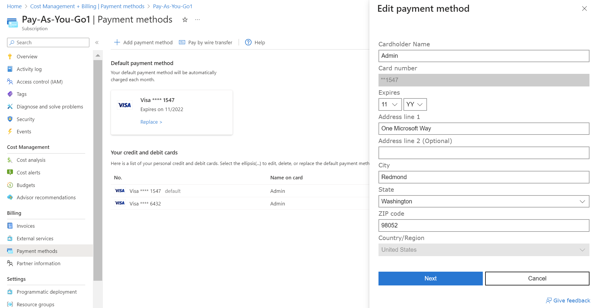 可在 Azure 门户中编辑信用卡详细信息(例如更新到期日期):