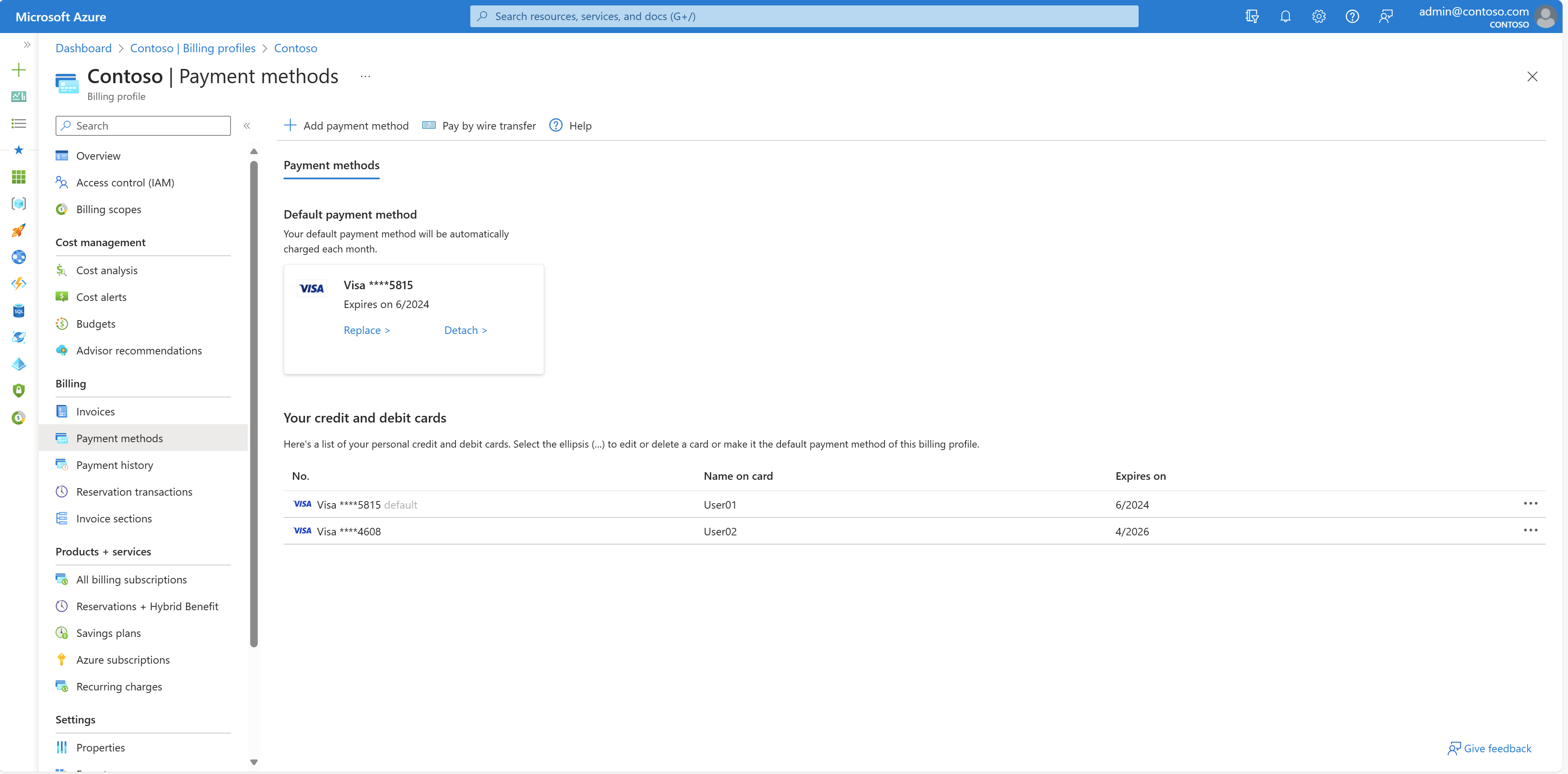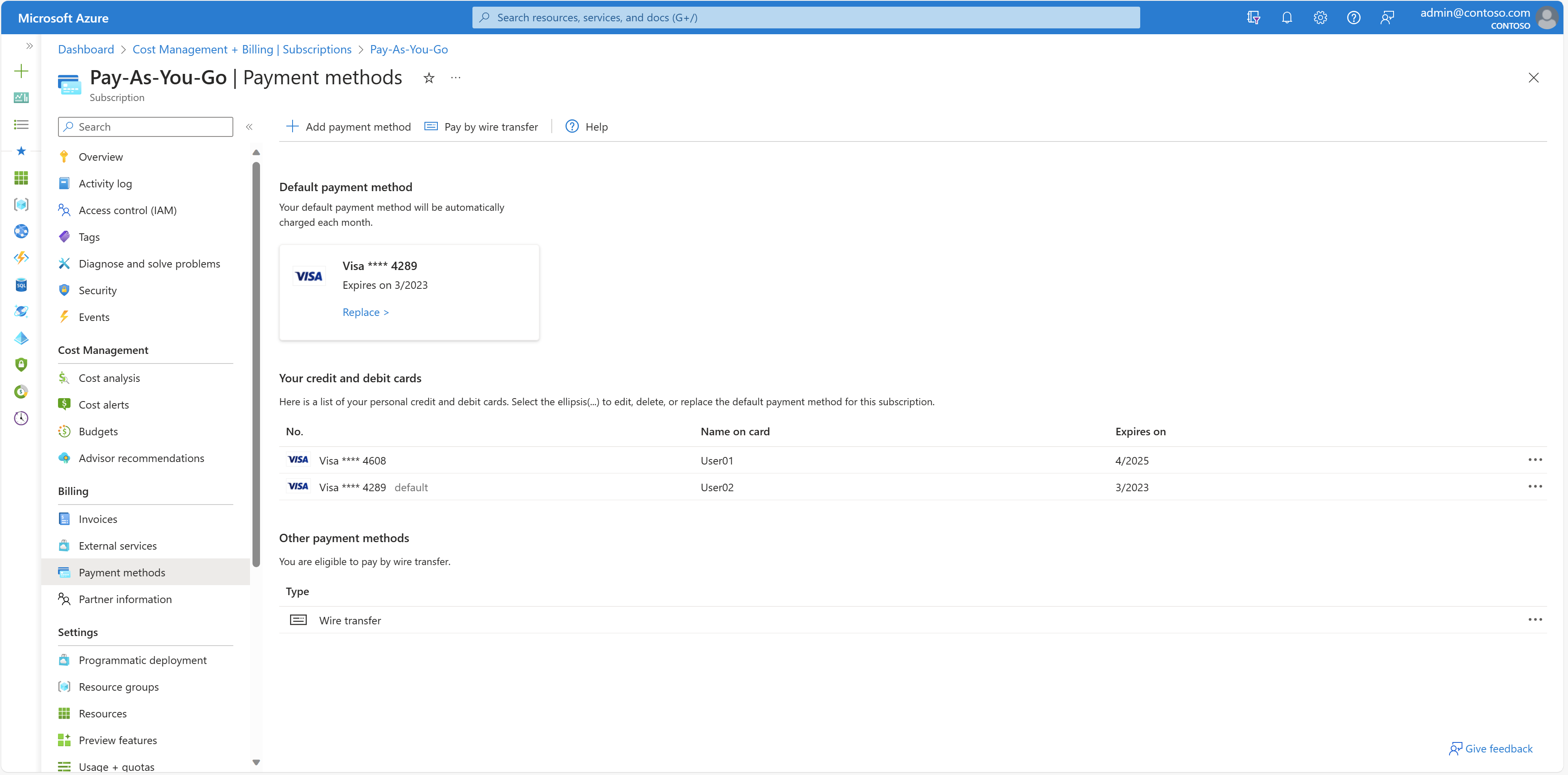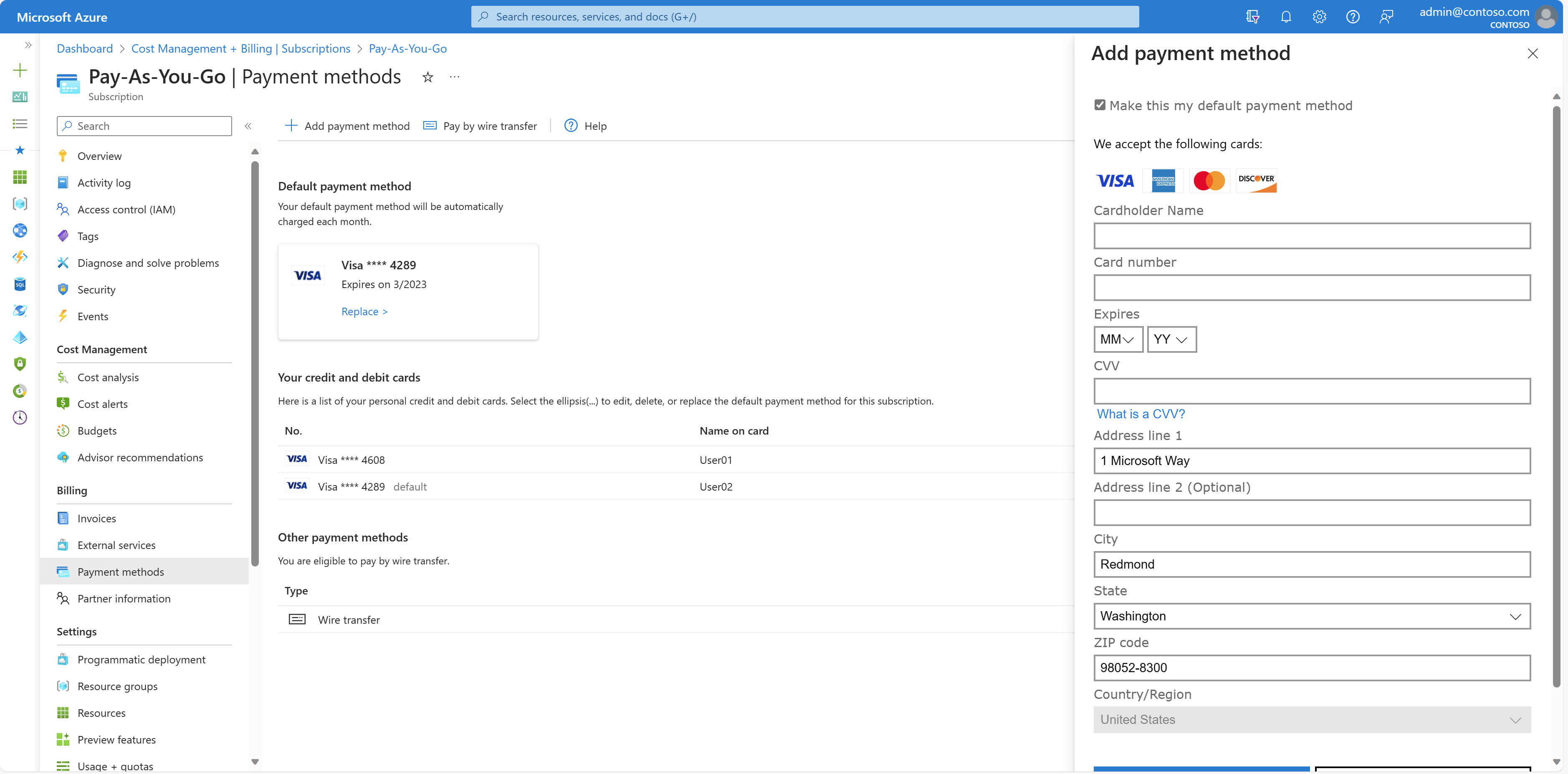 Azure 支持的付款方式为信用卡、借记卡和电汇。 Azure 不支持虚拟卡或预付卡。 若要查看支持的付款方式的完整列表,请参阅 支持的付款方式。
