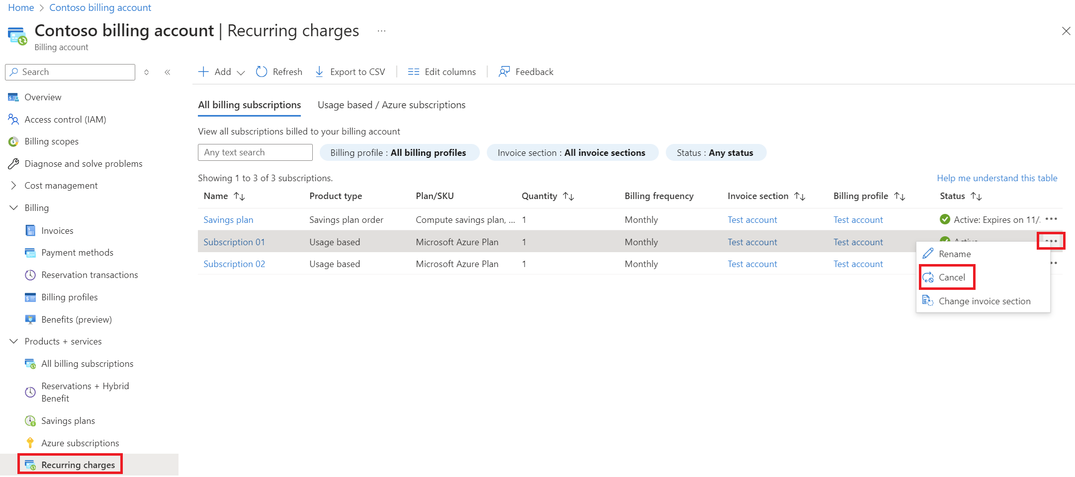在“ 定期收费 ”页上,选择行右侧的省略号(...),然后选择“ 取消”。