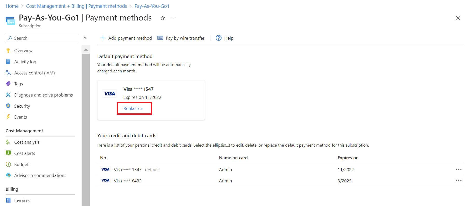 可在 Azure 门户中,将 Azure 订阅的默认信用卡更改为新卡或以前保存的卡。 只有帐户管理员才能更改信用卡。