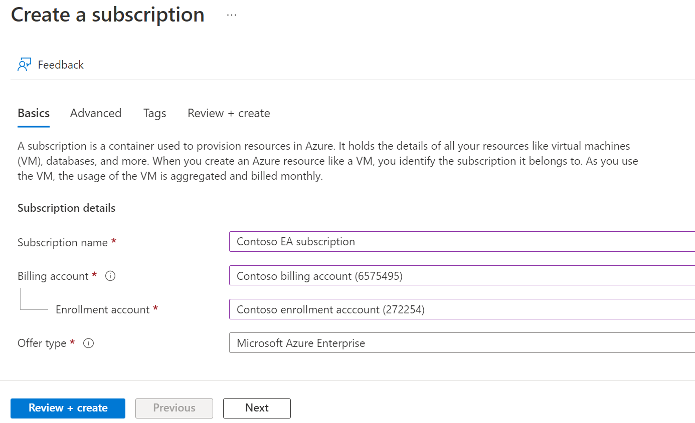 本文可帮助你为自己或当前 Microsoft Entra 目录/租户中的其他人创建企业协议 (EA) 订阅。 你可以另外创建一个订阅来避免达到订阅限制,为安全性创建单独的环境,或者因为合规性原因而隔离数据。