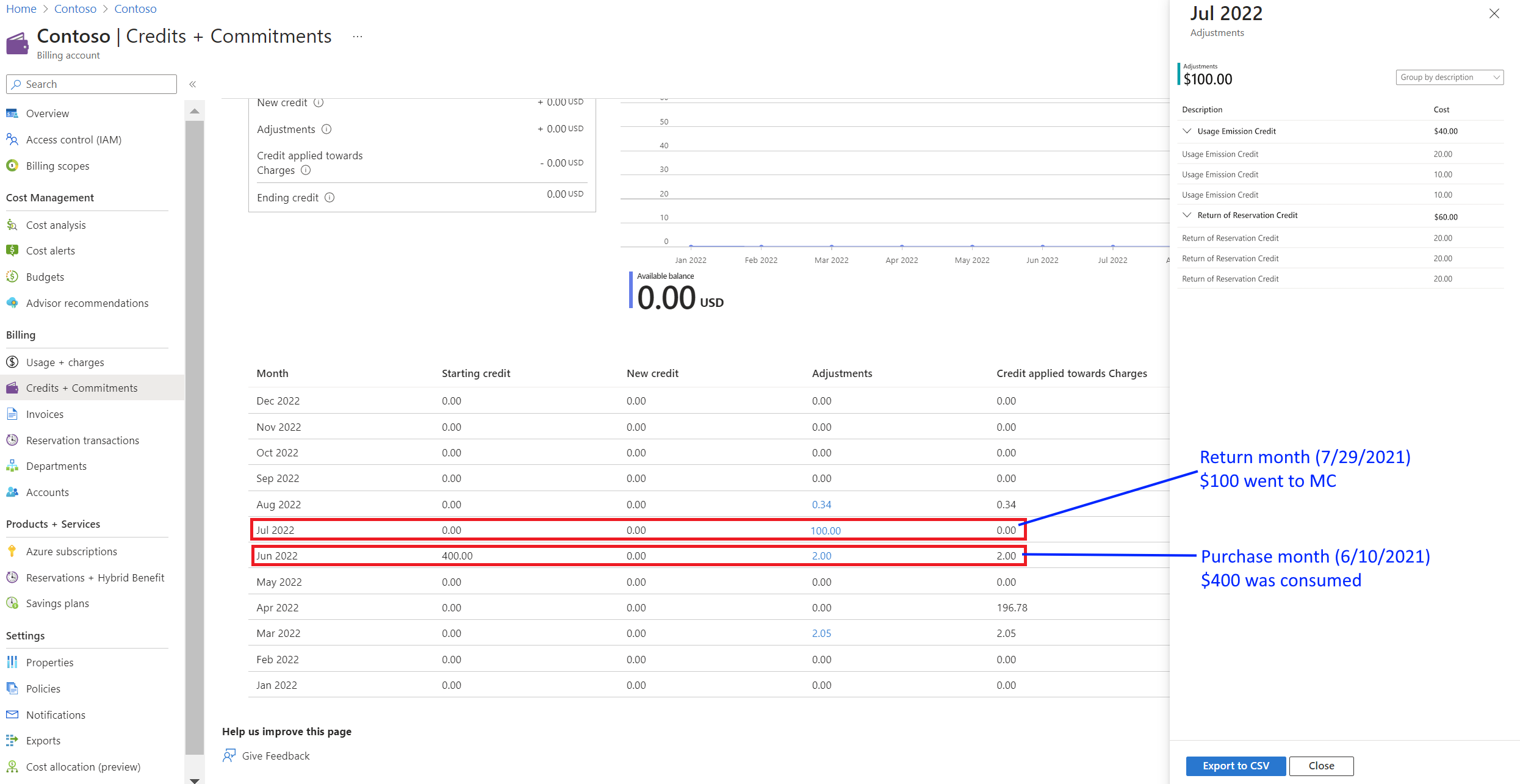 - 完成 2022 年 7 月的预留项退还后,你有权获得价值 100 美元的额度。 你会收到退款金额的贷项凭单。 可在“发票”页上查看此信息。 “使用情况和费用”页面的“退还的超额额度”下会显示相同的额度。 100 美元的调整显示在“额度 + 承诺”页上。 “额度 + 承诺”页上显示调整方面没有变化。
