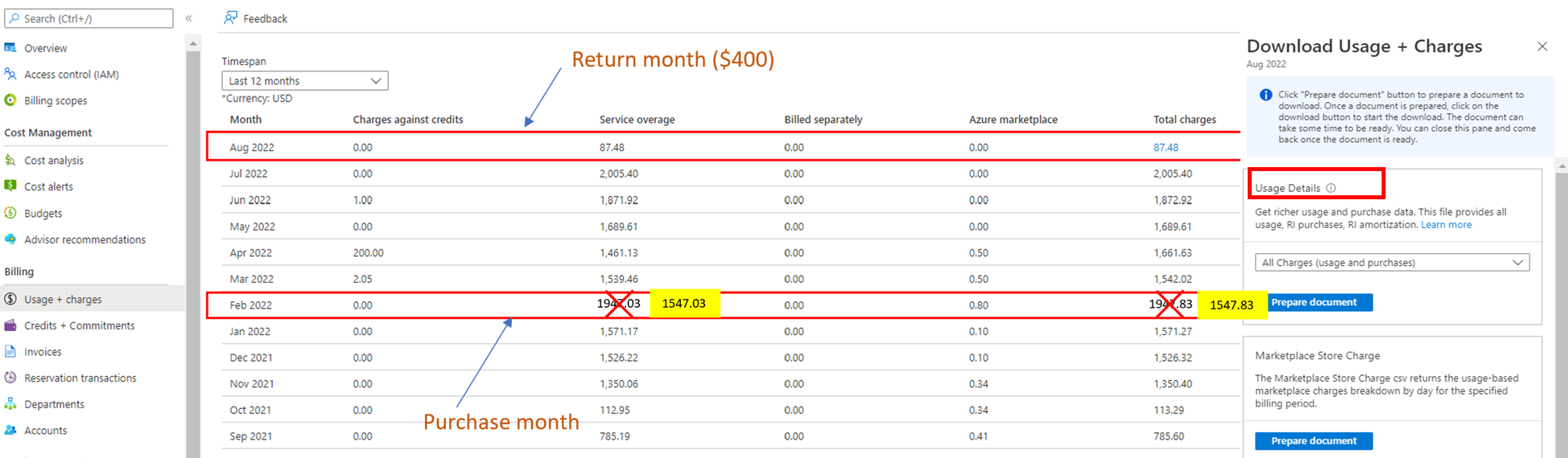 让我们来看一下先前流程中的详细超额退款示例。 假设你在 2022 年 2 月使用超额额度购买了一个预留(不涉及 Azure 预付款或货币承诺)。 你在 2022 年 8 月决定退回该预留。 退款使用的付款方式与购买时的相同。 因此,你在 2022 年 8 月会收到 2022 年 2 月计费周期的贷项凭单。 但是,额度反映的是购买月份。 在此示例中,购买月份为 2022 年 2 月。 退款会导致服务超额和总费用发生变化。