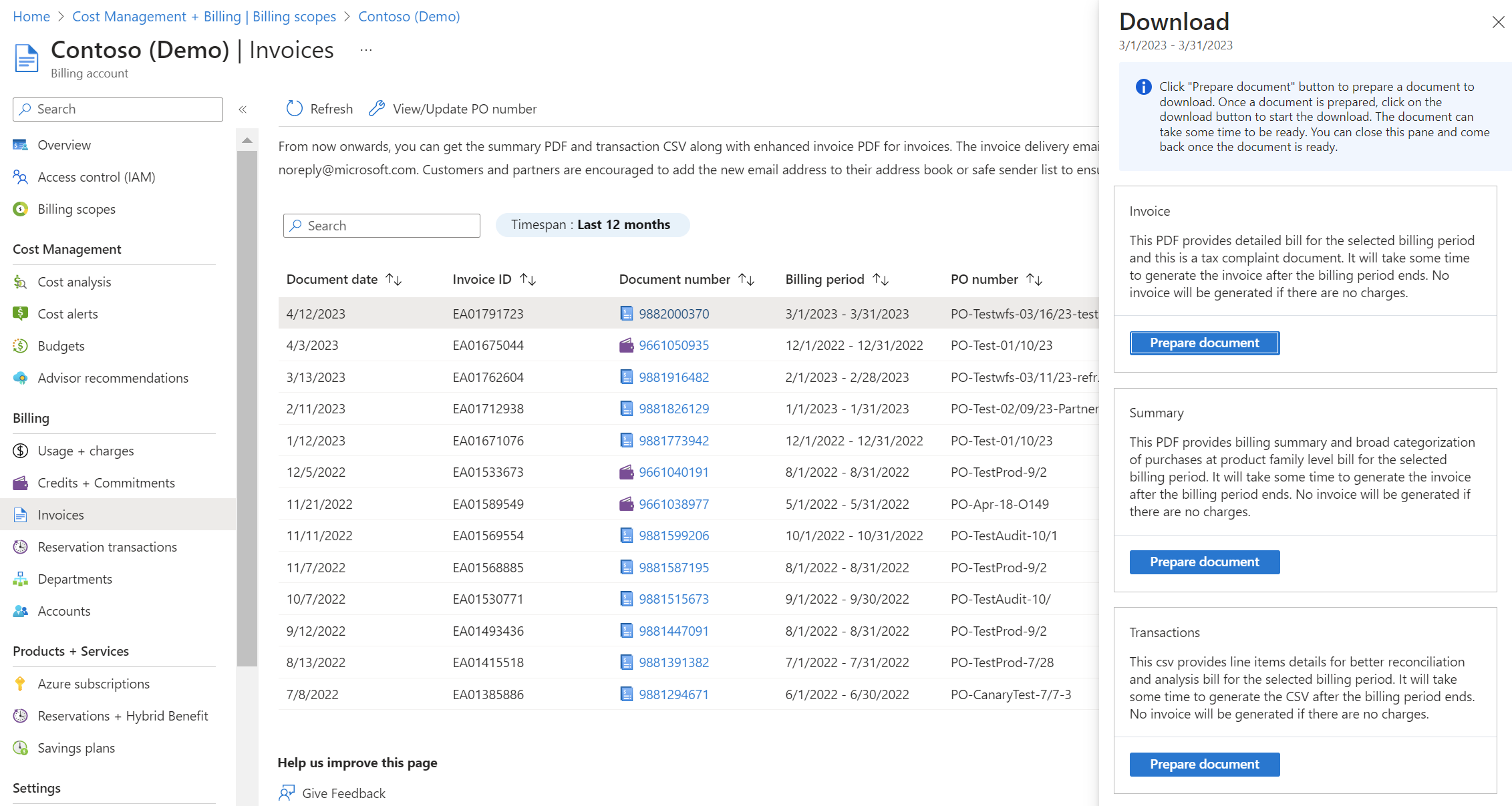 EA 管理员可以从 Azure 门户下载发票,也可通过电子邮件发送发票。 发票将发送给为合约设置的接收发票的人员。 如果 EA 管理员以外的人需要一份发票的电子邮件副本,EA 管理员可以向他们发送一份副本。