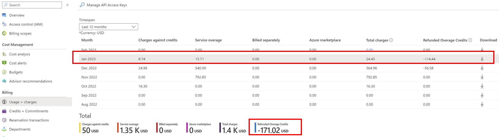 现在,为了防止新流程出现问题,以额度的形式进行退款。 退款不会对已结束的计费周期产生任何影响。 退款将按照你购买时使用的相同付款方式返还。 如果退款是由于超额导致的,会向你发出项贷凭单。 如果退款计入 Azure 预付款(也称为货币承诺付款 [MC]),则超额部分会导致发出项贷凭单。 Azure 预付款作为调整金进行应用。