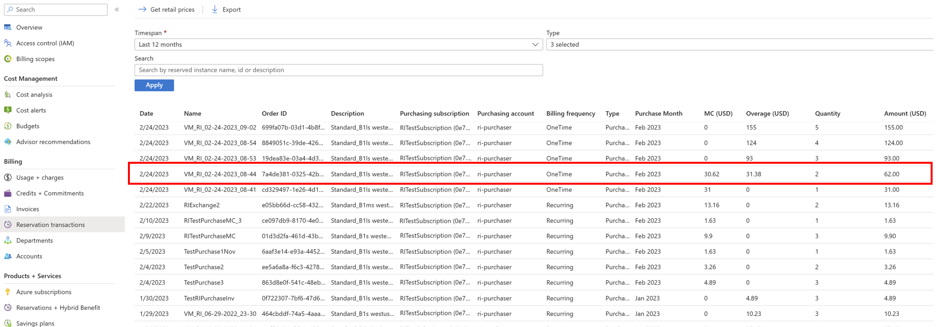 “预留交易”页上不会显示节省计划退款。 但是,“退款超额额度”会显示预留和节省计划退款的总和。