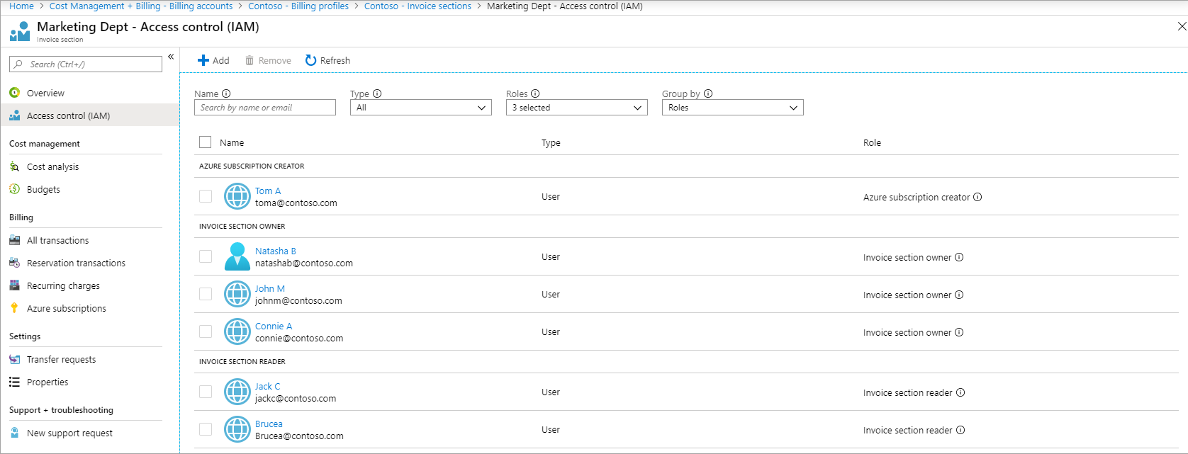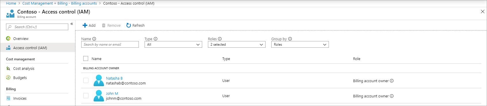 企业管理员将作为计费配置文件所有者列出,而拥有只读权限的企业管理员将作为计费配置文件读取者列出。 如果你认为缺少了任何企业管理员的访问权限,可以在 Azure 门户中为其授予访问权限。 有关详细信息,请参阅在 Azure 门户中管理计费角色。