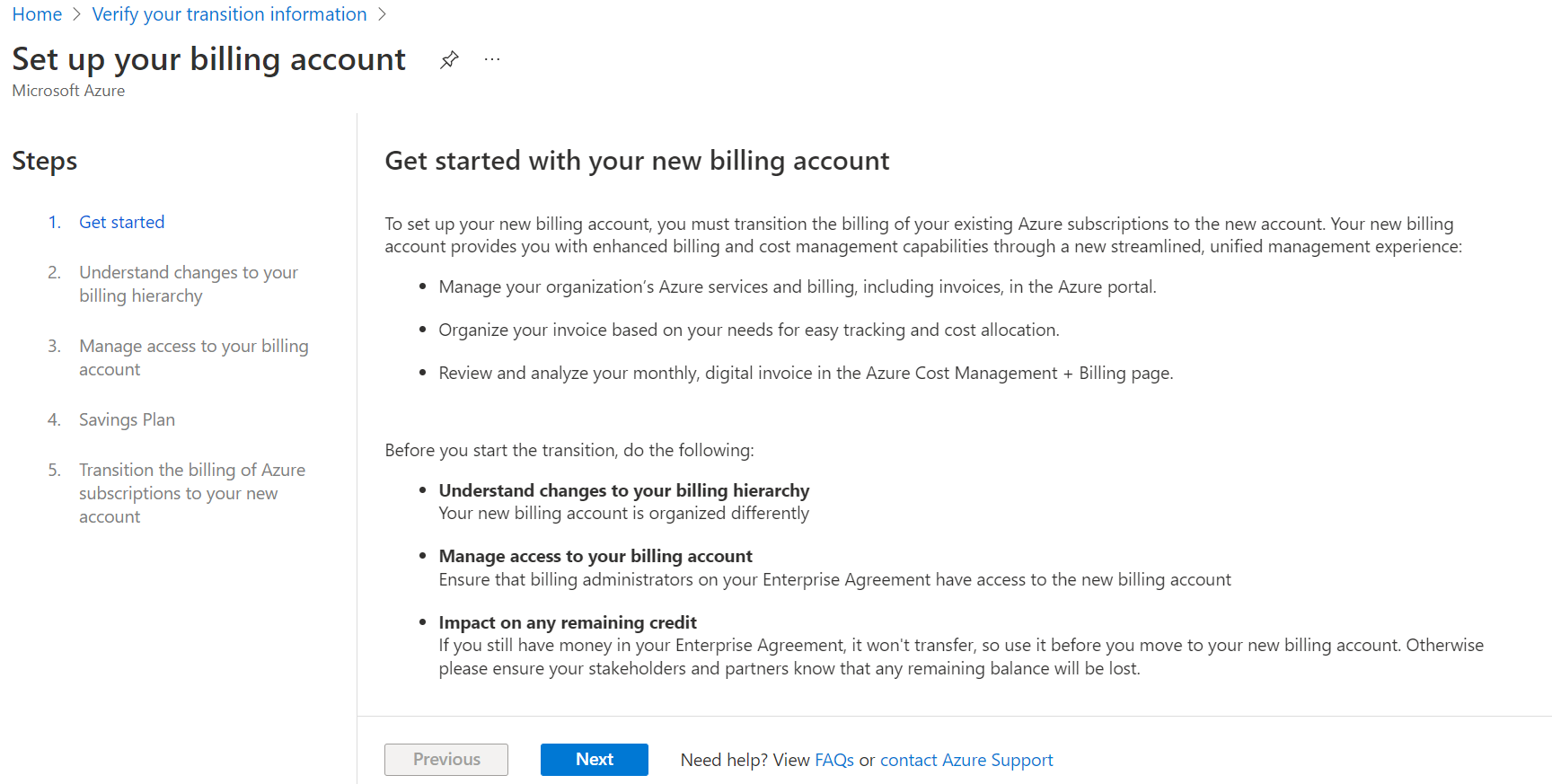 在转换过程中,支持权益不会转移。 购买新的支持计划可以获得新计费帐户中 Azure 订阅的权益。