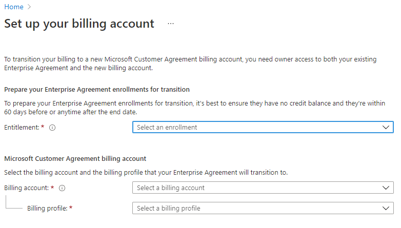 如果你同时具备企业管理员和计费帐户所有者角色,则会在 Azure 门户中看到以下页面。 你可以继续设置 EA 注册和 Microsoft 客户协议计费帐户以供转换。