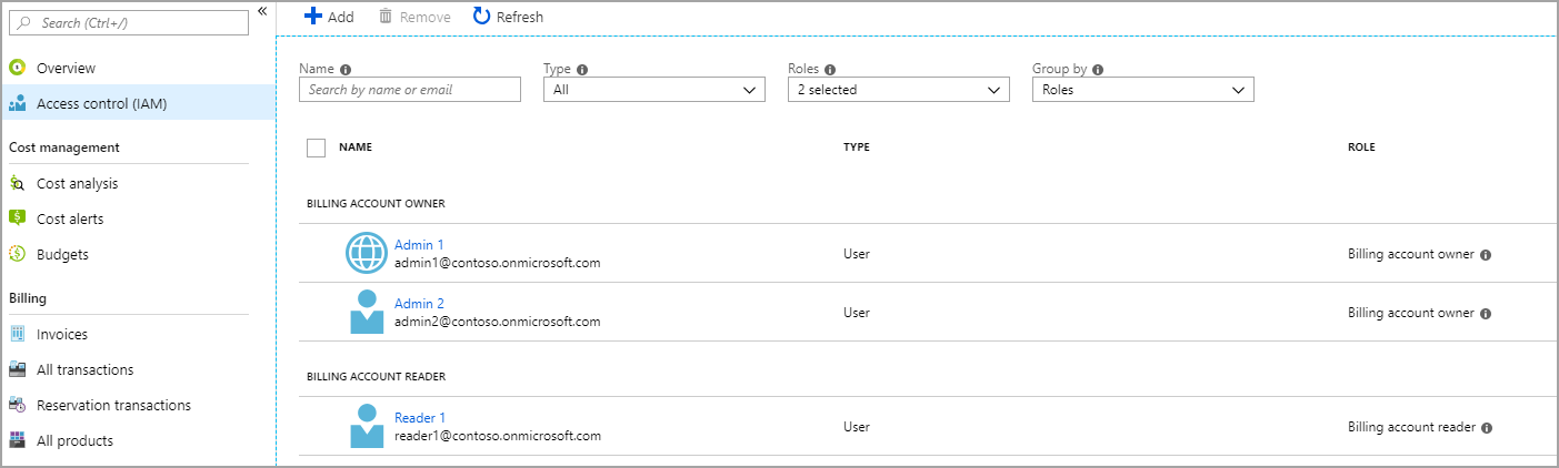 若要管理Microsoft Customer Agreement的计费帐户,请使用以下部分中介绍的角色。 这些角色是Azure用于控制对资源访问的内置角色之外的附加角色。 有关详细信息,请参阅 Azure 内置角色。