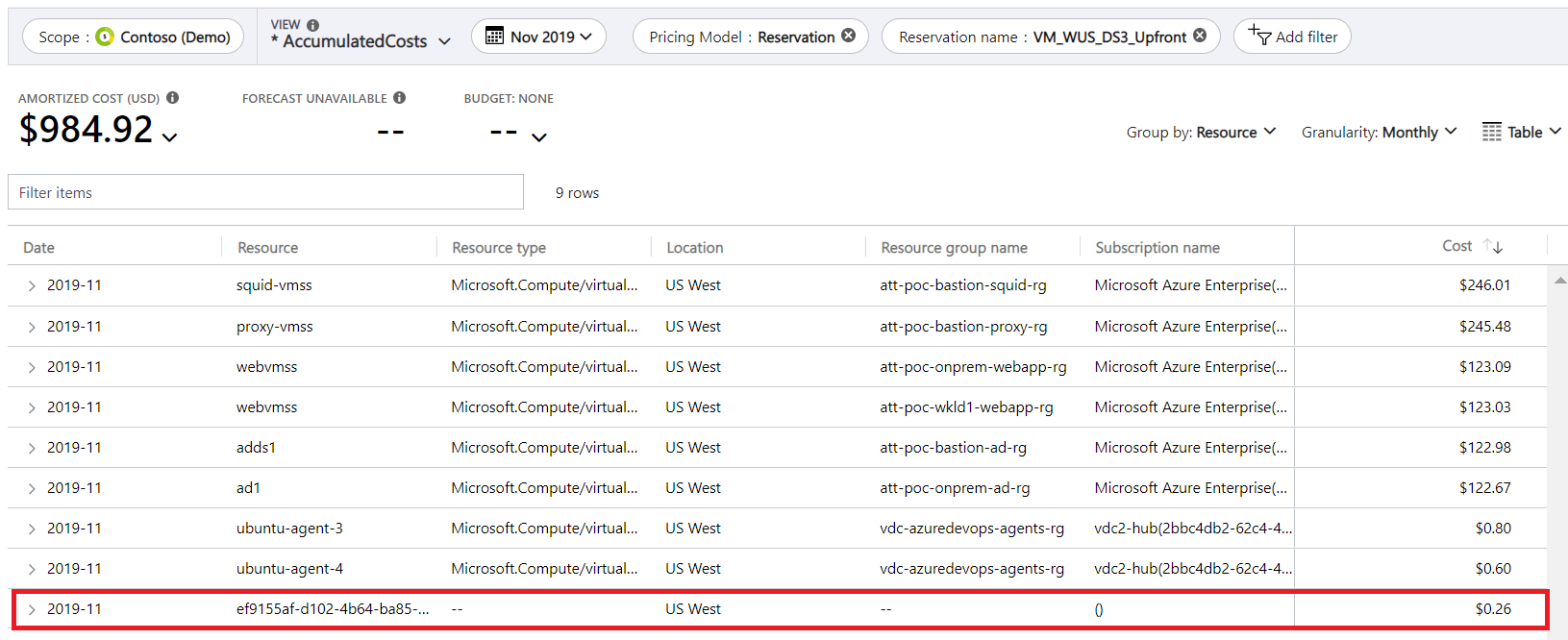 - 若要更轻松地查看单个资源的成本,请选择图表列表中的 “表 ”。 根据需要展开对象。 下面是 2019 年 11 月的一个示例,其中显示了使用预留的 8 个资源的摊销预留成本。 突出显示的成本是预留的未使用部分。