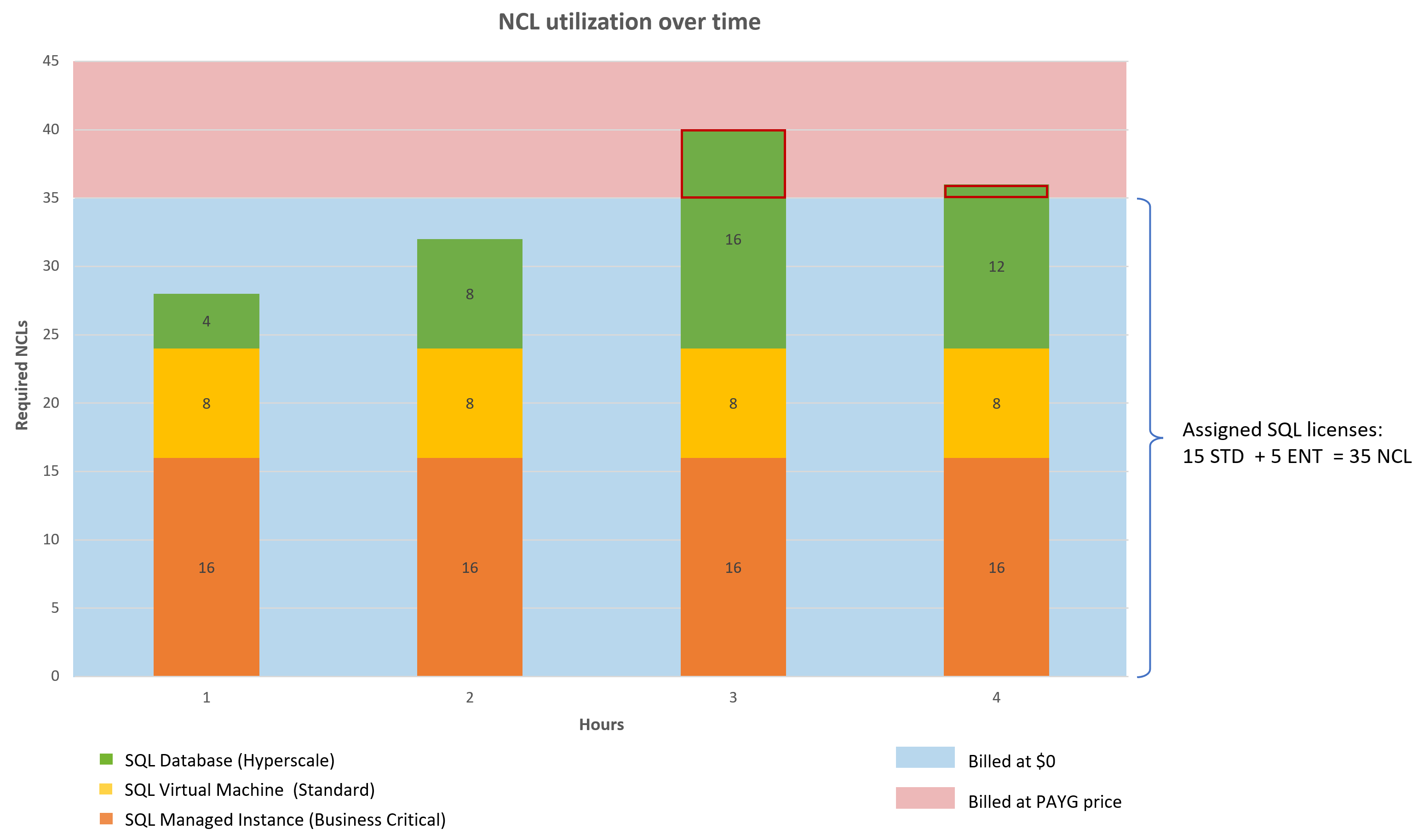 每个资源使用适当的全价或即用即付计量,每小时报告一次使用情况。 在 Azure 内部,使用情况应用程序引擎会评估可用的规范化核心 (NC),并将其应用于该小时。 对于给定小时的 vCore 资源消耗,如果所选范围内存在足够的未利用 NC,即用即付计量将切换为价格为零 ($0) 的相应 Azure 混合权益计量。