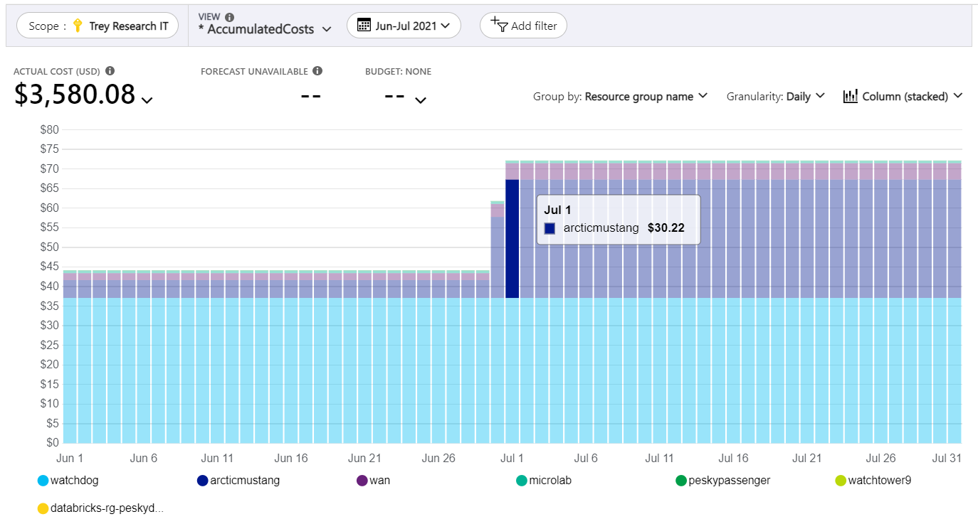 到目前为止,我们发现 articmustang 资源组在 6 月底和 7 月初增加了成本。 你可能注意到,成本有两天持续增加。 这种变化之所以持续了两天,是因为在一天的中途发生的变化只会在第二天才能完全表现出来。