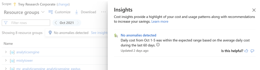 选择订阅范围时,成本分析智能视图中提供了异常情况检测。 可以在见解中查看异常情况状态。