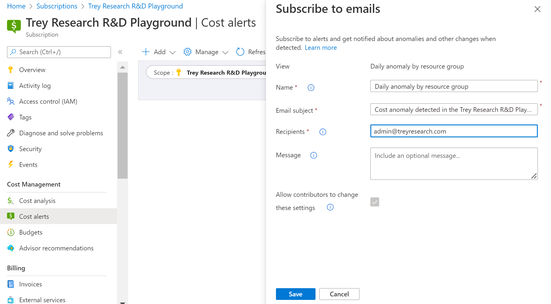 你可以创建警报,以在检测到异常情况时自动收到通知。 创建异常情况警报需要成本管理参与者或更高角色,或者需要自定义角色的 Microsoft.CostManagement/scheduledActions/write 权限。 有关详细信息,请参阅每个角色的特征行为。