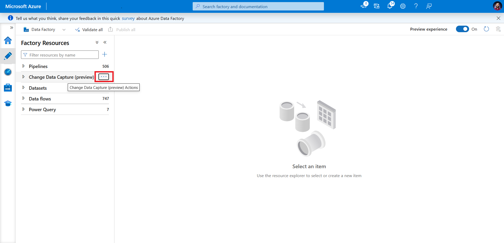 转到数据工厂中的“创作”窗格。 在“管道”下,会出现一个名为“变更数据捕获(预览版)”的新顶级项目。