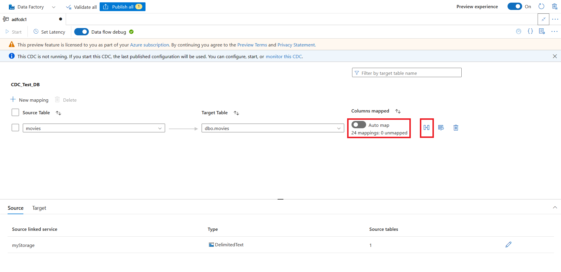 选择表后,默认情况下会映射表的列,并启用“自动映射”开关。 自动映射会在接收器中自动按名称映射列,在源架构演变时拾取新的列更改,并将此信息流向受支持的接收器类型。
