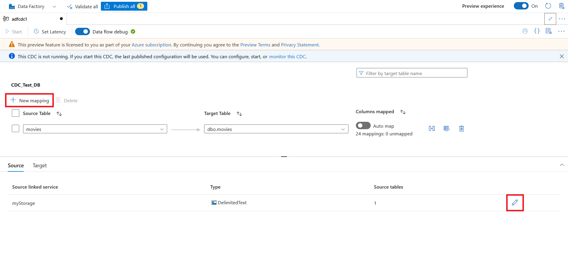 可以在一个 CDC 项目中添加更多源到目标映射。 使用“编辑”按钮以添加更多数据源和目标。 然后选择“新建映射”,并使用下拉列表设置新的源和目标。 可以为其中每个映射单独打开或关闭自动映射。