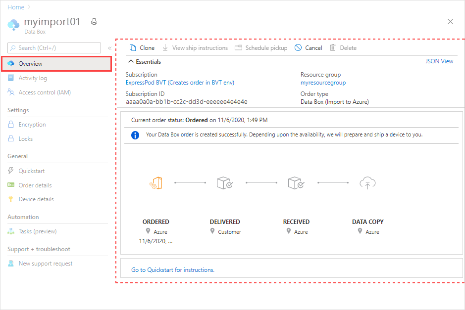 导航到 Data Box 订单的 “概述 ”页。