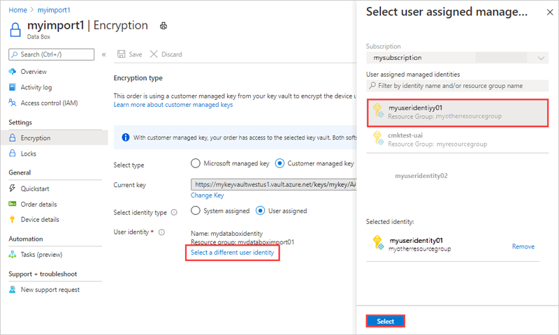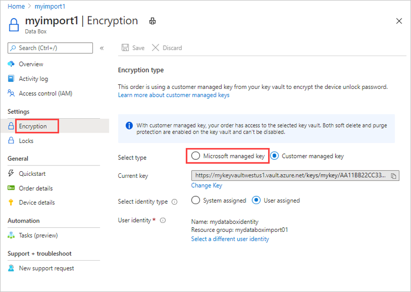 若要在整个订单过程中保持此级别的控制,请在创建订单时使用客户管理的密钥。 有关详细信息,请参阅 Tutorial: Order Azure Data Box。