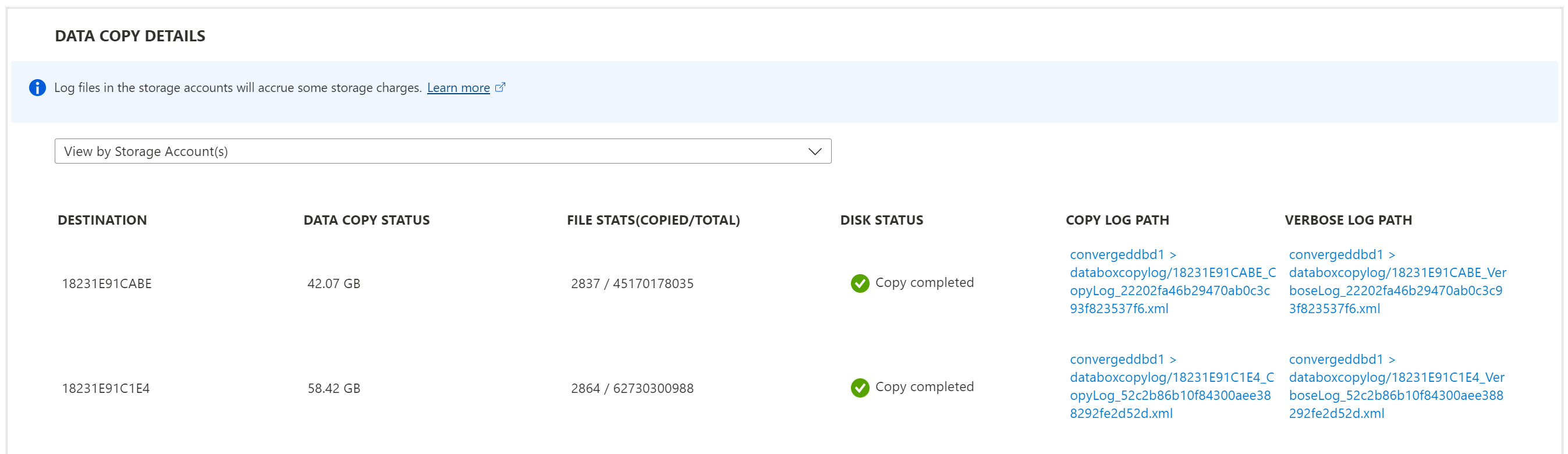 将磁盘连接到 Azure 数据中心的服务器后,会自动复制数据。 根据数据大小,复制操作可能需要几小时到几天的时间才能完成。 可以在门户中监视复制作业的进度。