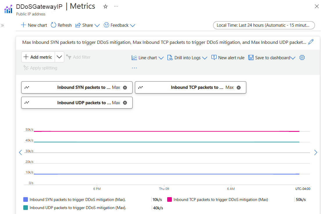 You can see the policy limits within your public IP address metrics by choosing the Inbound SYN packets to trigger DDoS mitigation, Inbound TCP packets to trigger DDoS mitigation, and Inbound UDP packets to trigger DDoS mitigation metrics. Make sure to set the aggregation type to Max.