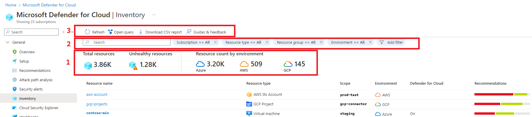 Defender for Cloud 会定期分析与其连接的资源的安全状态。 当资源具有与之关联的活动安全建议安全警报时,它们就会出现在清单中。