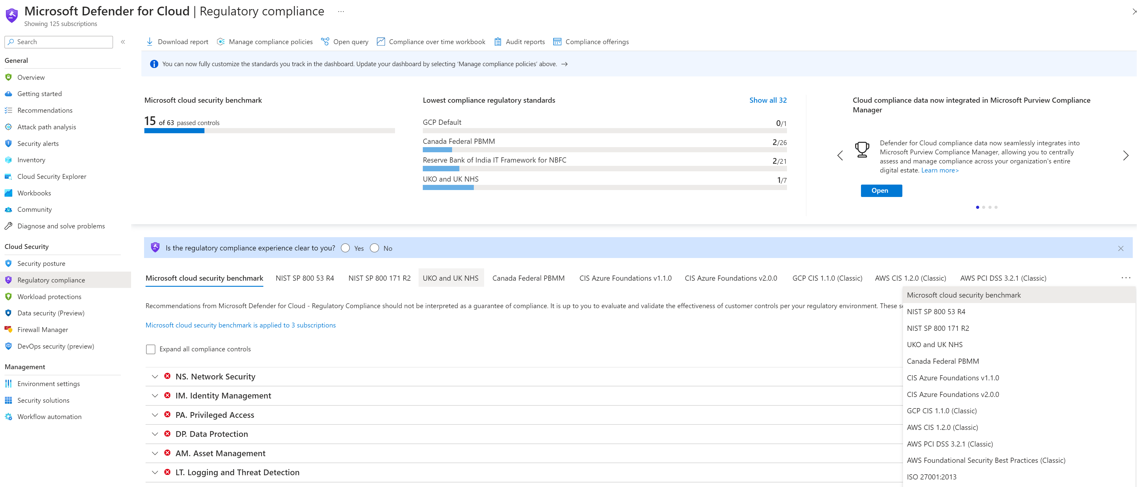 行业标准、法规标准和基准在 Defender for Cloud 中表示为安全标准,并显示在“法规合规性”仪表板中。