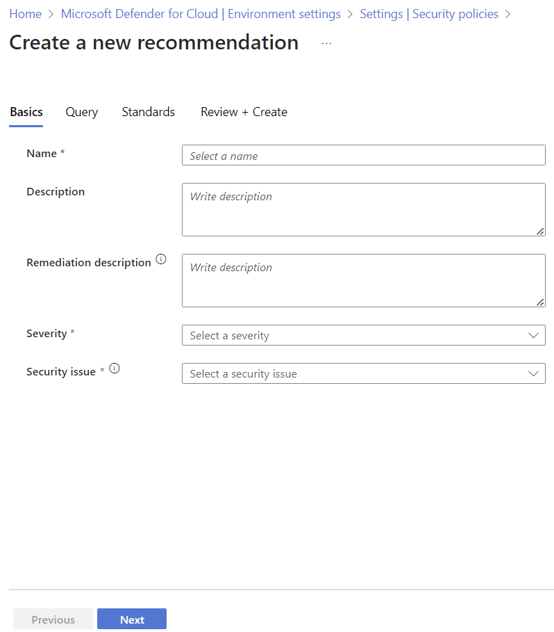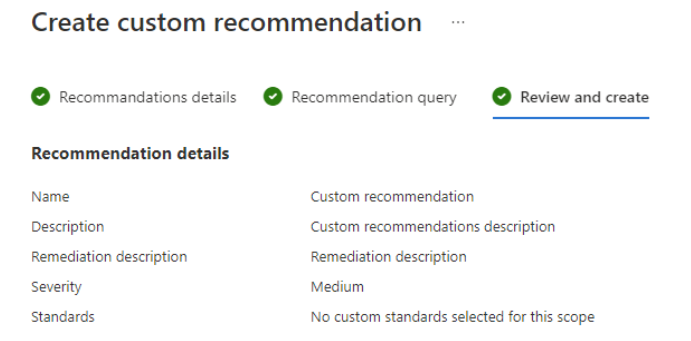 通过 Microsoft Defender for Cloud 提供的内置建议包括严重性级别和修正说明等详细信息。 如果要将此类型的信息添加到 Azure 的自定义建议中,请使用 REST API。