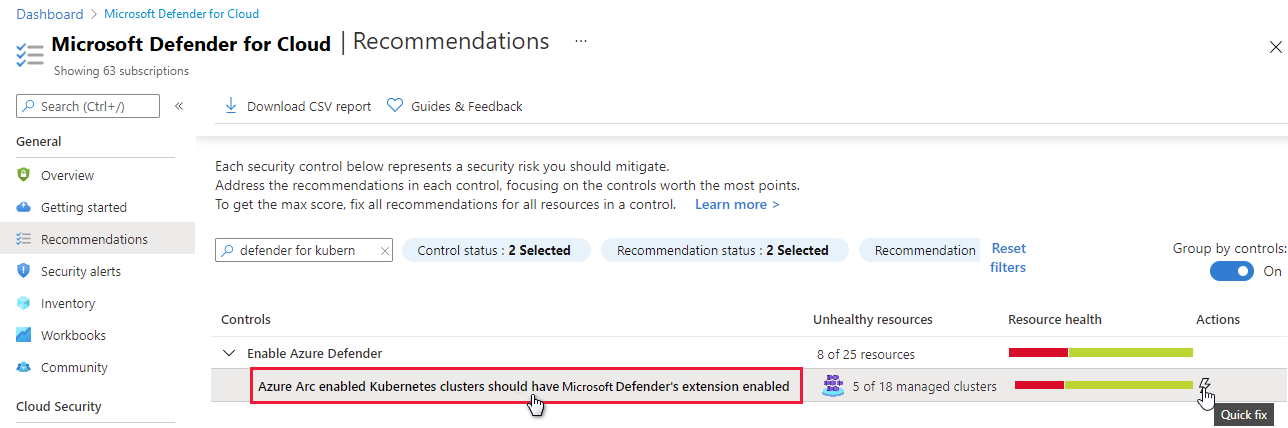 搜索“已启用 Azure Arc 的 Kubernetes 群集应已安装 Defender 扩展”。
