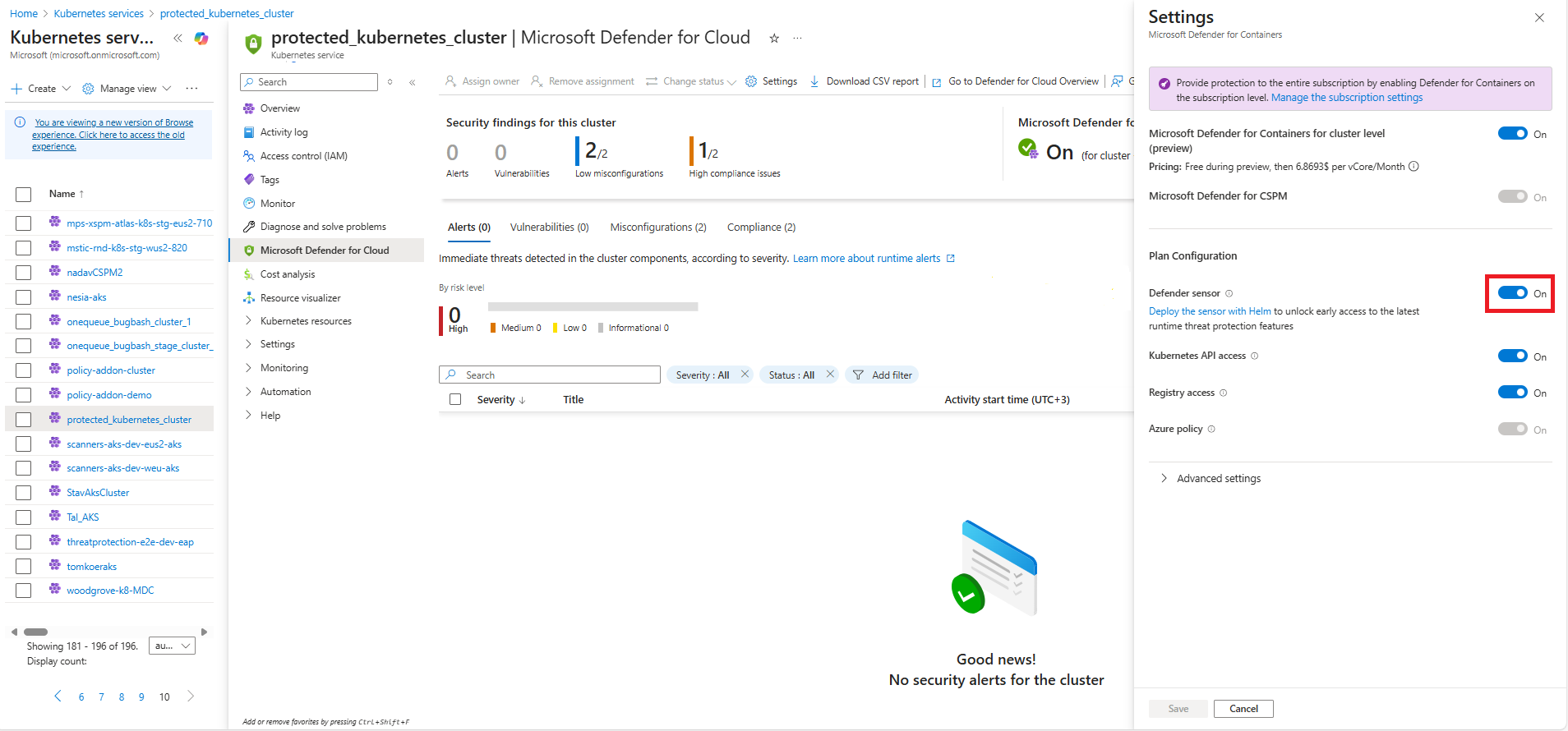 保存更改后,Defender for Cloud 会自动开始将所选组件部署到 AKS 群集: