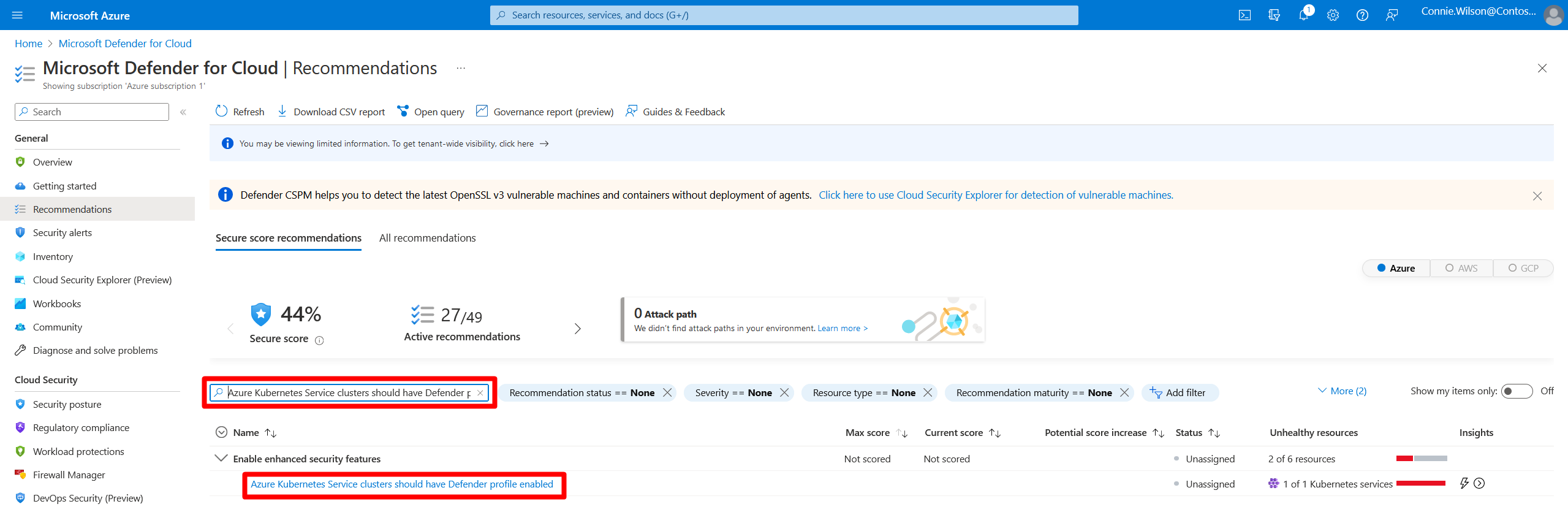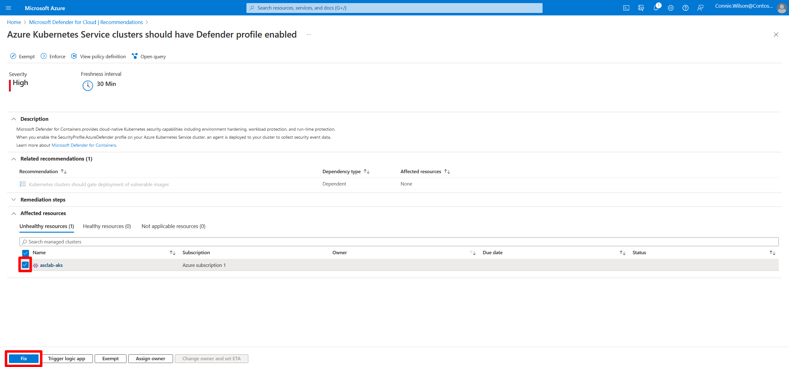 - 查看建议 - 处理已识别的 AKS 集群安全问题