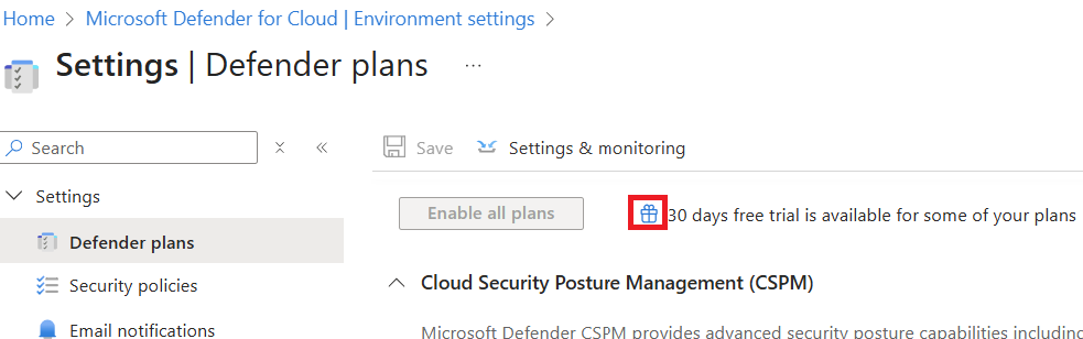 首次在 Azure 订阅上启用 Microsoft Defender for Cloud 时,会自动启动 30 天的试用版。 在此试用期内,可以探索 Defender for Cloud、基础云安全状况管理(CSPM)和 对 Microsoft Defender XDR 的访问权限。