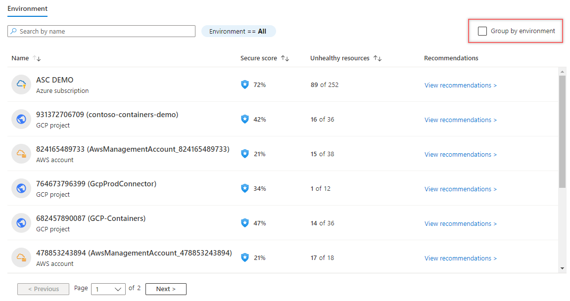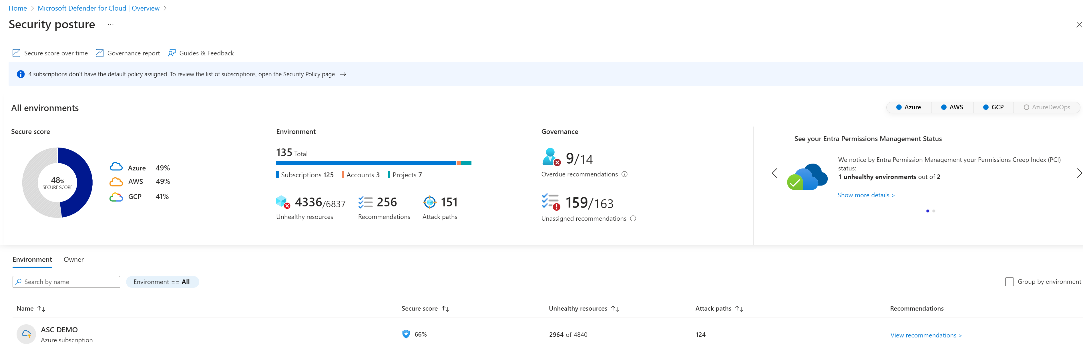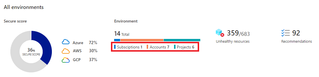 Defender for Cloud 中的“安全状况”页面显示环境的整体安全分数以及单独每个环境的安全分数。