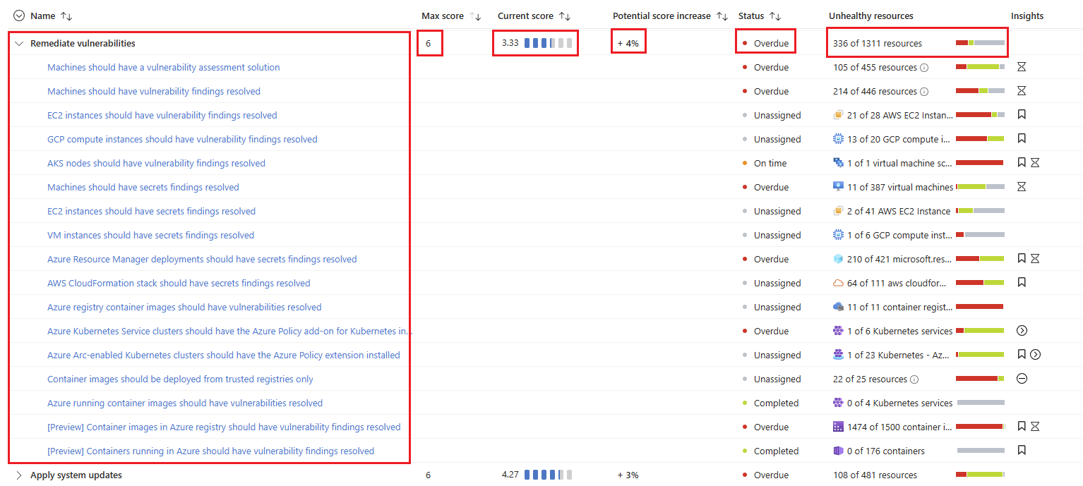 | 潜在分数增加 | 控制中可提升的剩余分值。 如果纠正此控制项中的所有建议,分数增加 4%。 潜在分数增加=[每个资源的分数]*[运行不正常的资源数] |