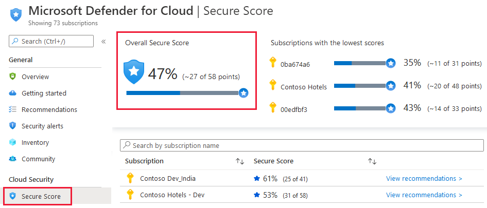可以通过 Azure 门户或编程方式查找总体安全分数以及每个订阅的分数,如以下各部分所述: