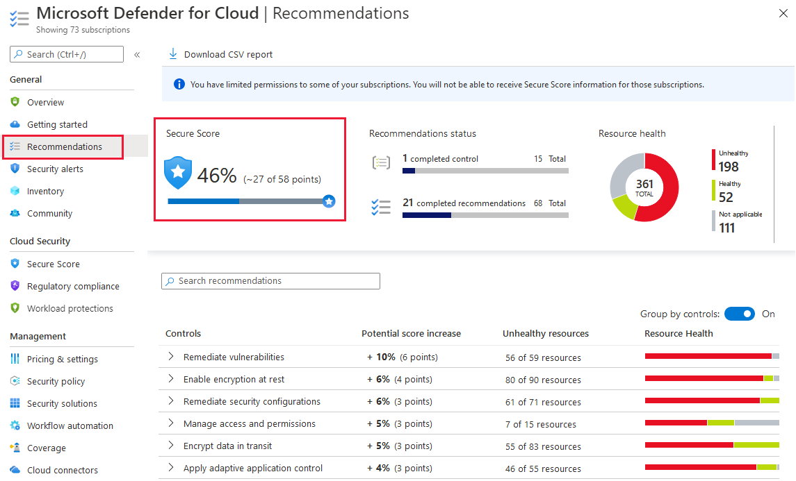 若要获得某个安全控制所有可能的分数,你的所有资源都必须符合该安全控制中的所有安全建议。 例如,Defender for Cloud 提供有关如何保护管理端口的多个建议。 你需要修正所有问题以提升你的安全评分。