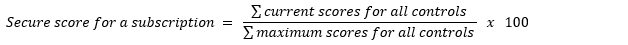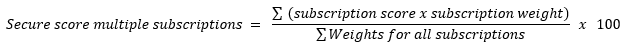 多个订阅和连接器的综合得分会加入每个订阅和连接器的“权重”。 Defender for Cloud 根据线性加权模型确定订阅和连接器的相对权重,该模型使用每个订阅的健康资源和不健康资源的组合数(不包括“不可用”资源)。 每个订阅和连接器的当前分数与单个订阅或连接器的计算方式相同,然后应用其权重(见公式)。 如果针对特定控件的订阅或连接器没有进行任何评估(既没有正常资源也没有不正常资源),那么该控件将不计入该订阅或连接器的分数计算。 在这种情况下,该控件的当前点数和最大潜在点数都不计入该订阅的分数。 UI 中显示的聚合安全分数不是每个订阅百分比或按控制计数的简单算术平均值;它是跨订阅的加权总和。 因此,UI 中显示的按控制资源编号不能用于在多个订阅中手动重新计算总体安全功能分数。