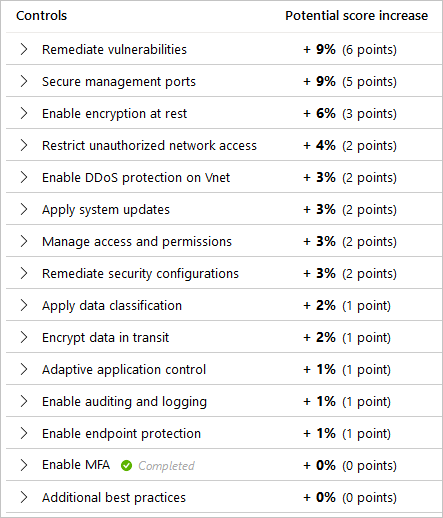 下表列出了 Microsoft Defender for Cloud 中的安全控件。 对于每个控件,如果你实现了控件中列出的针对所有资源的所有建议,则可以看到安全功能分数可增加的最大分数。