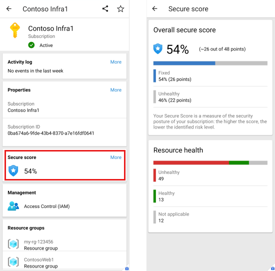 Azure 移动应用将安全分数显示为百分比值。 点击它可查看解释该分数的详细信息。