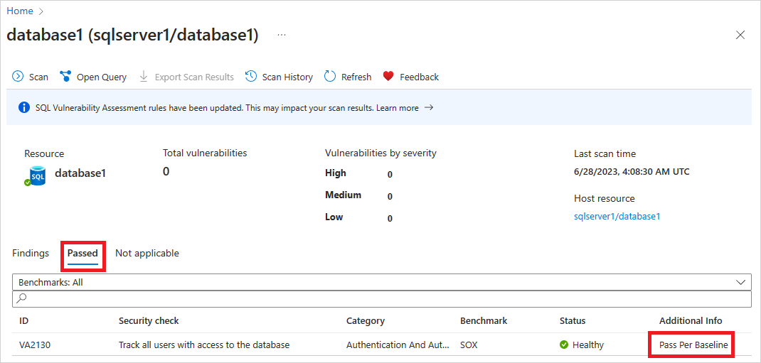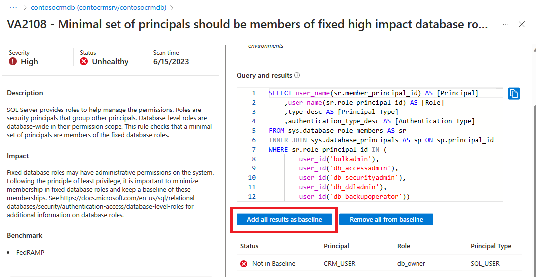 选择显示查询和结果以对每个受影响的数据库进行大规模基线设置。
