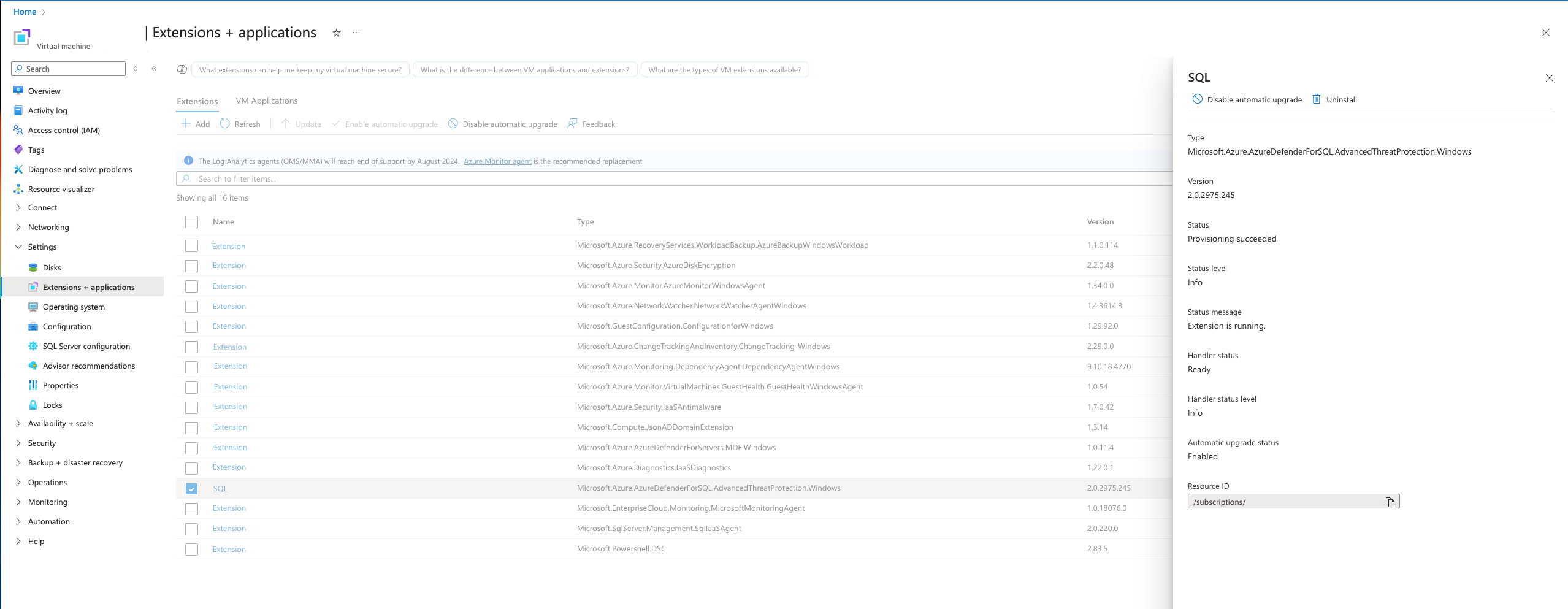 | Defender for SQL 扩展应为 up-to-date | 请在虚拟机或启用了 Arc 的服务器资源的“扩展”页面中更新扩展。 |
