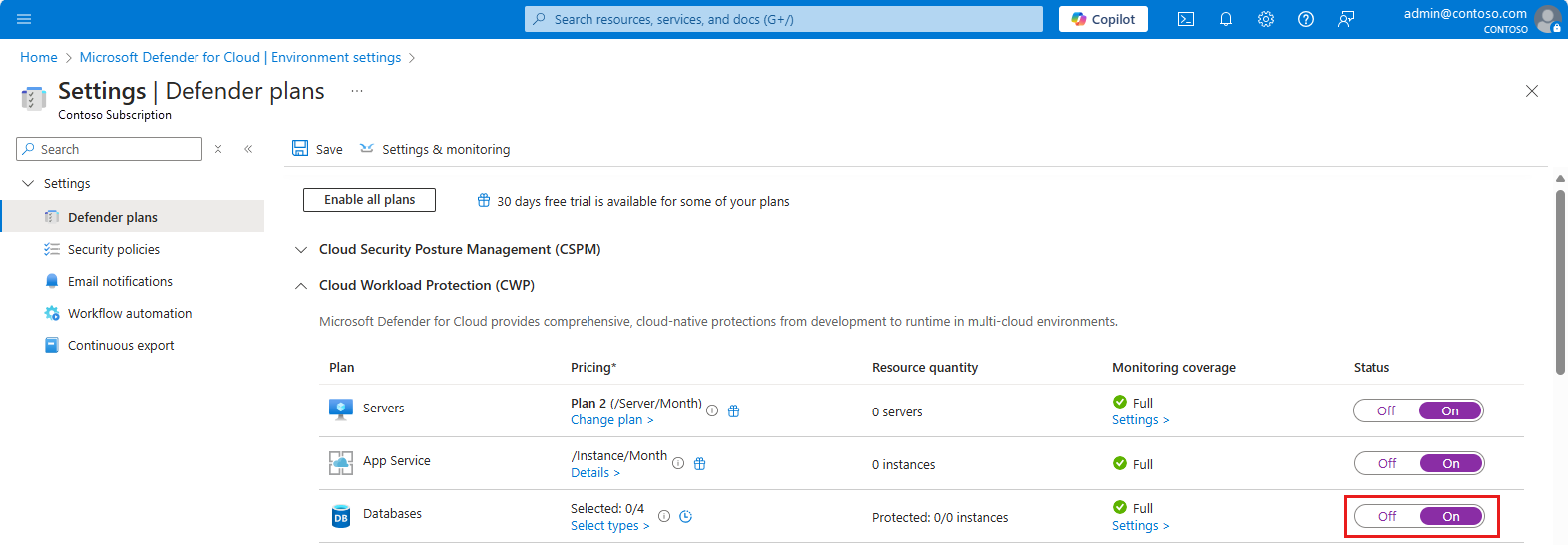 在“Defender 计划”页上,将“数据库”计划切换为“开”。