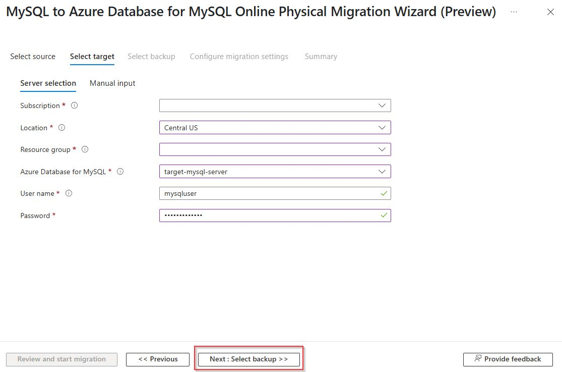 在“选择目标”屏幕的“自动服务器选择”下,选择“订阅”、“位置”、“资源组”、“Azure Database for MySQL 服务器名称”、“用户名”、“目标 Azure Database for MySQL 服务器的密码”,然后选择“下一步:选择备份>>”