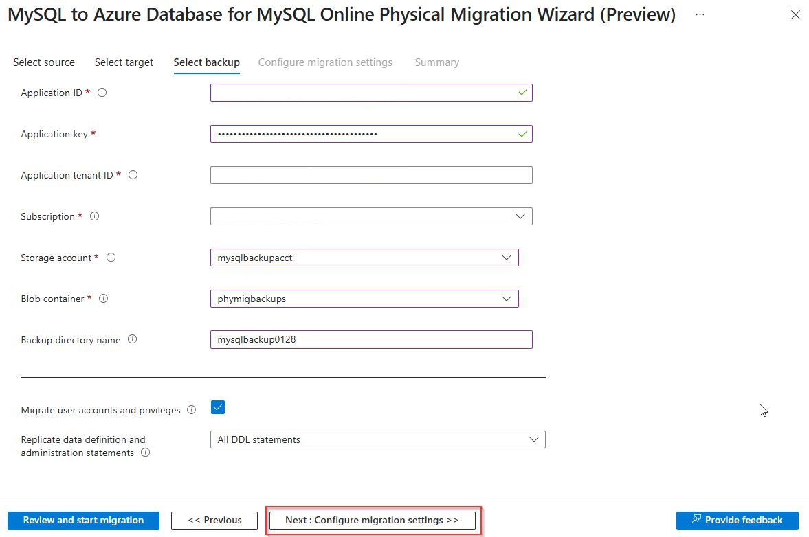 在“选择备份”屏幕上,输入应用注册的应用程序 ID、应用注册中的客户端密码、应用注册中的租户 ID、订阅、存储帐户名称、Blob 容器名称和存储 Percona XtraBackup 文件的备份目录名称,然后选择“下一步:配置迁移设置>>”