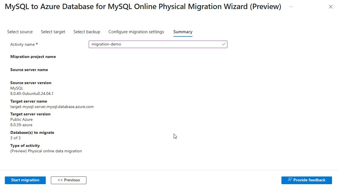 在 “新建迁移项目 ”页上,指定项目的名称。 在 “源服务器类型 选择”框中,选择 “MySQL”。 在 “目标服务器类型 ”选择框中,选择 Azure Database For MySQL。 在 “迁移活动类型 ”选择框中,选择 “[预览]”物理联机数据迁移。 然后选择“ 创建并运行活动”。