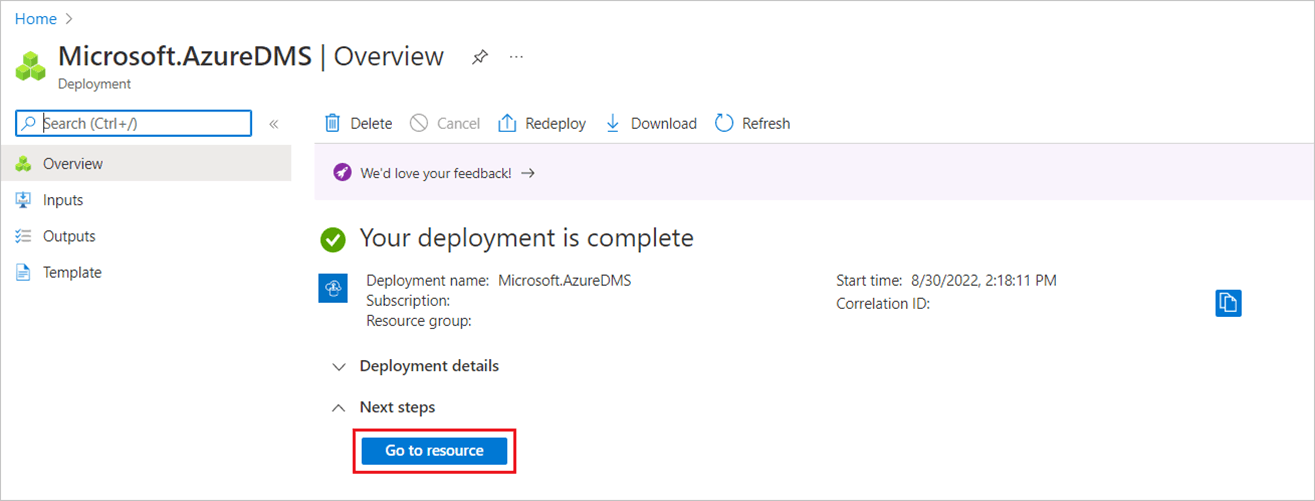 DMS 实例的部署现已开始。 消息“部署正在进行”显示几分钟,然后将其更改为“部署已完成”。