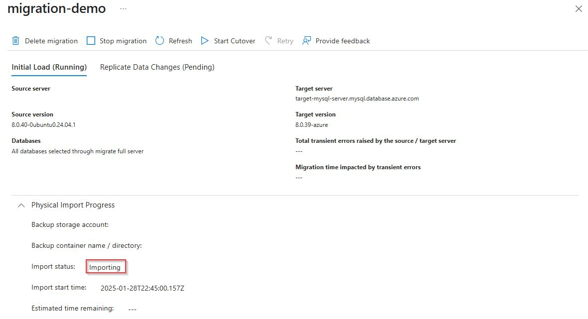 在迁移进行过程中,可以查看迁移的状态,并注意物理备份文件向目标 MySQL 灵活服务器的数据引入的状态,例如“正在导入”和“估计剩余时间”。