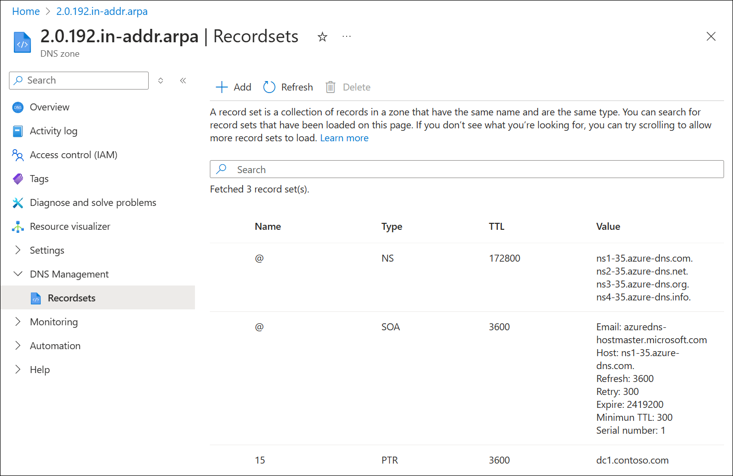 az network dns record-set list -g mydnsresourcegroup -z 2.0.192.in-addr.arpa