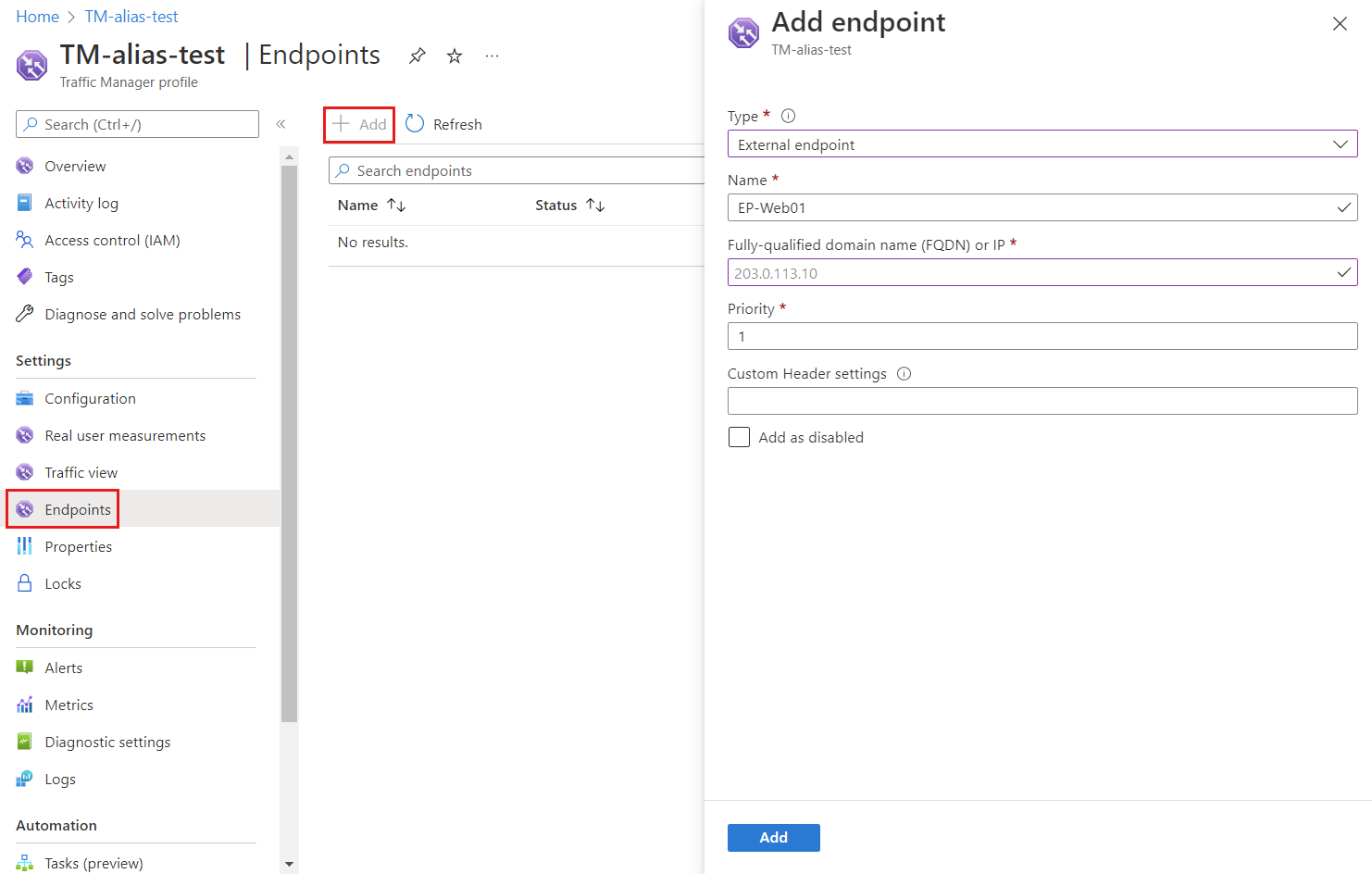 在 TM-alias-test 流量管理器配置文件的“终结点”页中,选择“+ 添加”,然后输入或选择以下信息: